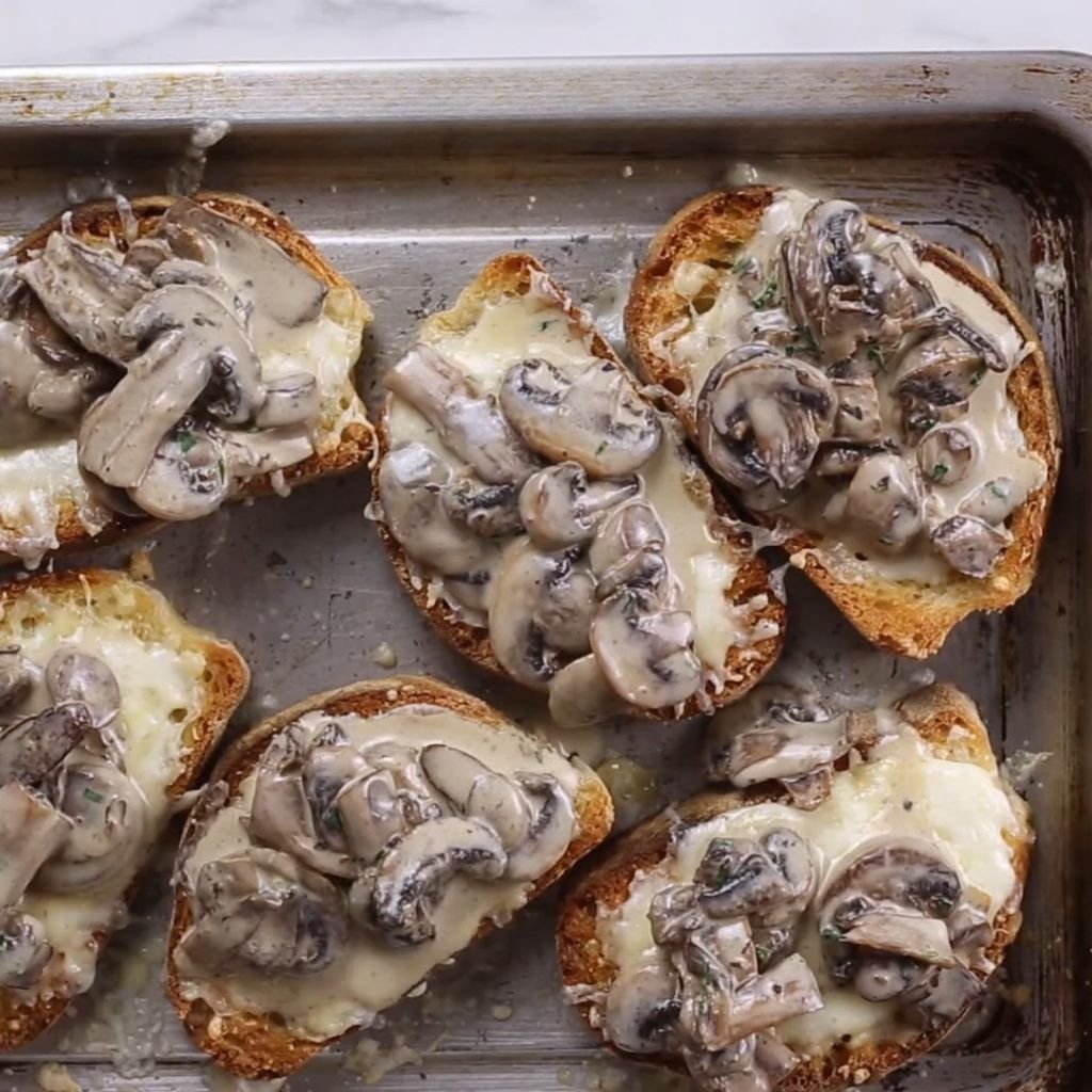 - Spoon a small amount of the mushroom mixture onto each toasted baguette slice.
