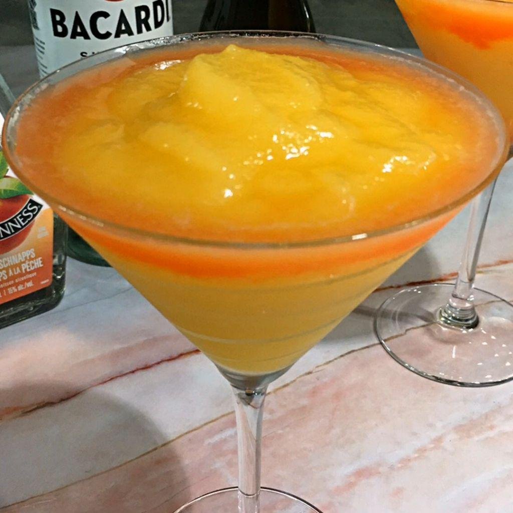 Peach Bellini Slush is light and bubbly in flavor. It blends peach nectar with sparkling wine for a soft frozen texture.