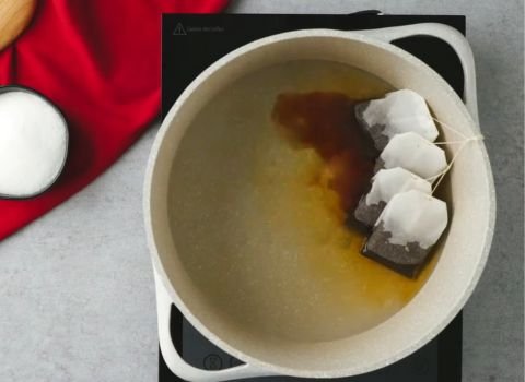 Place 4 tea bags into the hot water. Let the strings hang over the side so they are easy to pull out later.